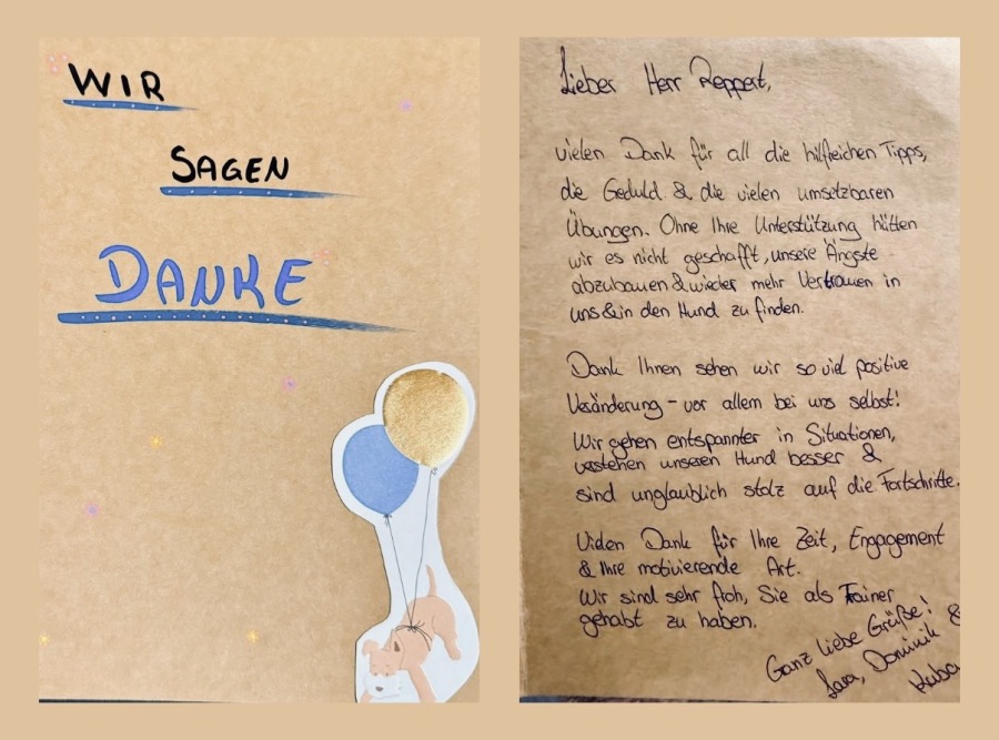 vielen Dank für all die hilfreichen Tipps, die Geduld & die vielen umsetzbaren Übungen. Ohne Ihre Unterstützung hätten wir es nciht geschafft, unsere Ängste abzubauen & wieder mehr Vertrauen in uns & in den Hund zu finden.